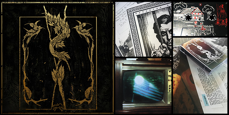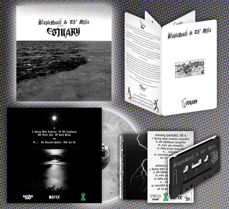 Pressed on 180 gram black-&-white marbled vinyl, ESTUARY is packaged with an 8-page 8.5x11" illustrated lyrics booklet. Ltd. edition of 200 copies. RIFT comes on a high-bias, professionally manufactured two-tone cassette with hand-numbered covers. Only 50 copies made. Prices include shipping.